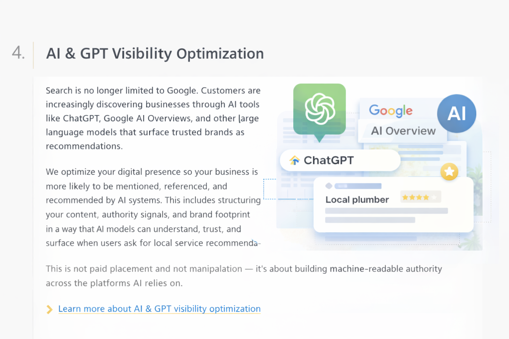 We optimize your digital presence so your business is more likely to be mentioned, referenced, and recommended by AI systems. This includes structuring your content, authority signals, and brand footprint in a way that AI models can understand, trust, and surface when users ask for local service recommendations.